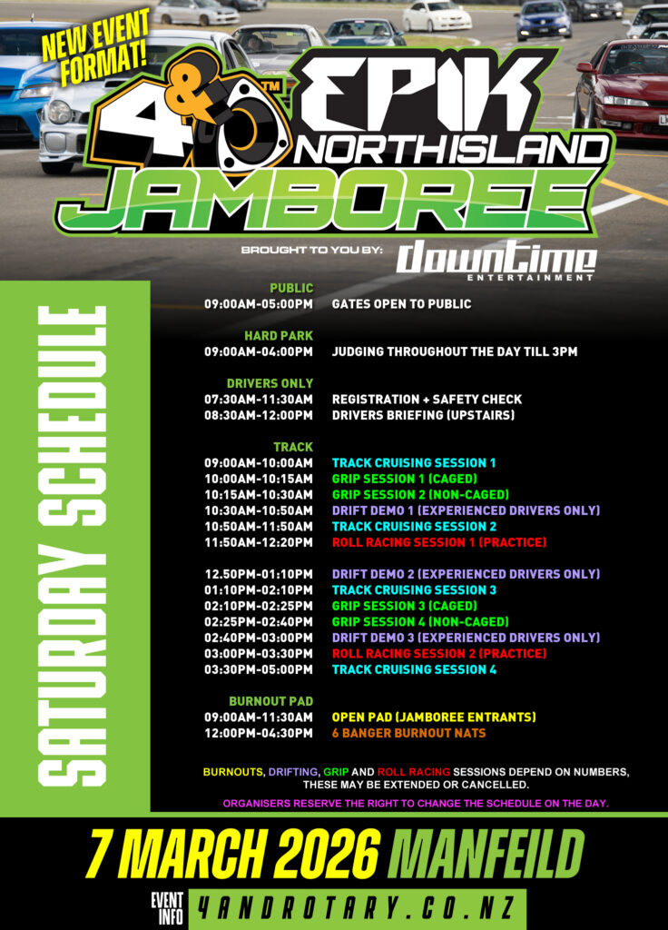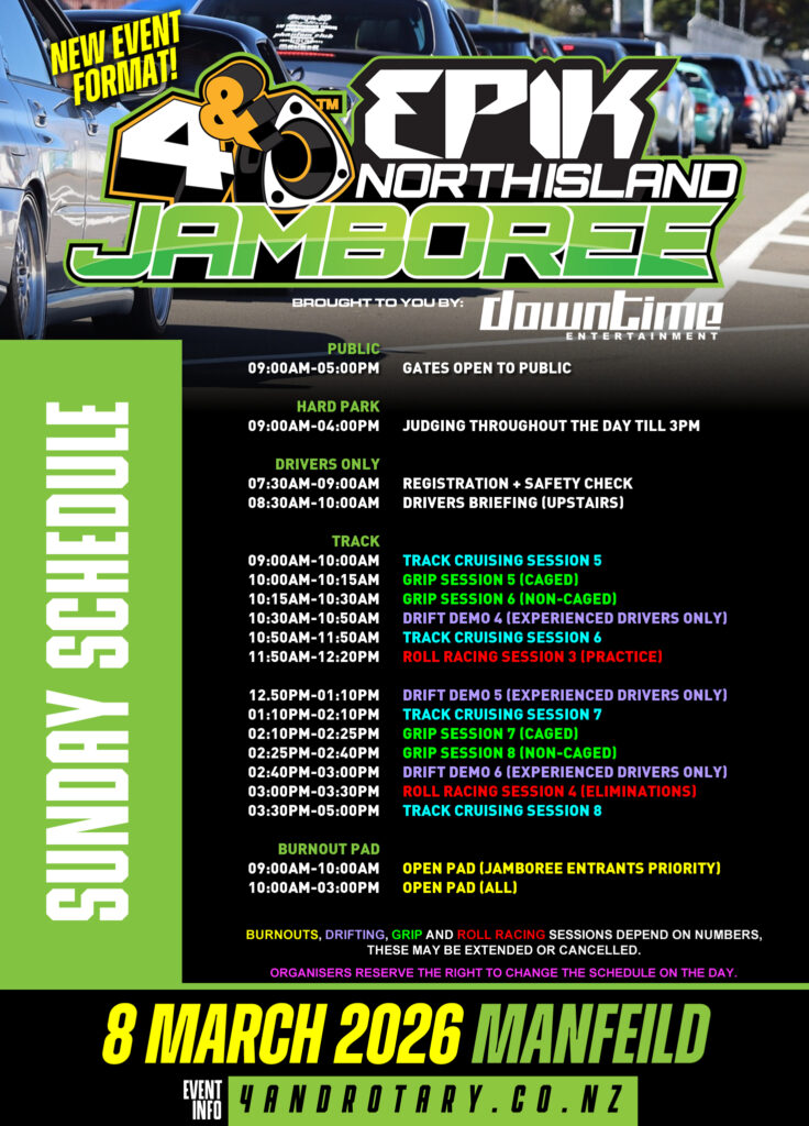 The Show & Shine portion of Jamboree will combine with REVCON on Saturday, 9 May 2026 at Claudelands Events Centre, Hamilton. REVCON is the fresh evolution of the iconic 4 & Rotary Nationals (and now Jamboree) Show & Shine — completely overhauled and rebranded for 2026 and beyond. The Show & Shine at Jamboree will be replaced with a Hard Park with awards/prizes/activities (more info to come).
